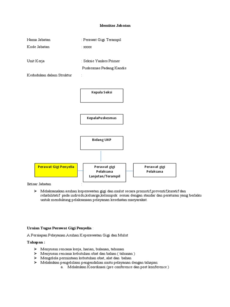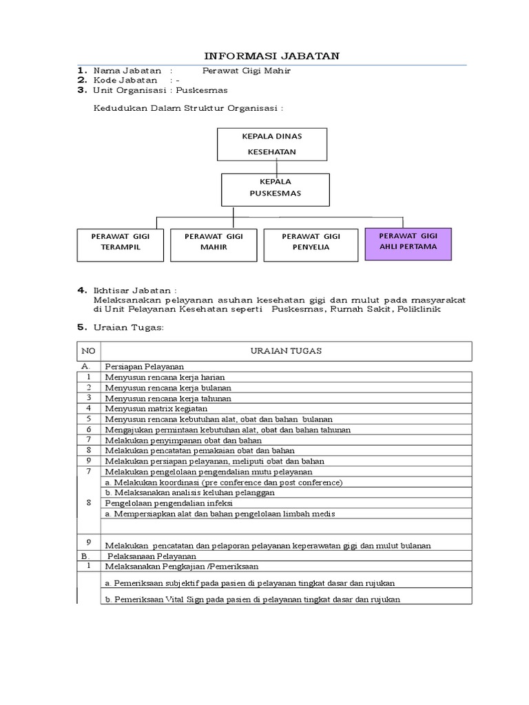 Perawat gigi dalam melaksanakan tugas dokter gigi, meskipun bukan kompetensi dan kewenanganya menjadi suatu kebiasaan dan kewajaran untuk membantu masyarakat dalam mengatasi masalah kesehatan di luar jam kerja/praktek dirumah. Dokter gigi madya upt puskesmas tegalrejo. Perawat gigi pelaksana pemula dan perawat gigi pelaksana mempunyai tugas sebaga berikut: Gigi pelaksana lanjutan perawat gigi penyelia. Hubungan perawatgigi denganmasyarakat hubungan perawat gigi dengan pasien (masyarakat) adalah suatu wahana untuk mengaplikasikan.